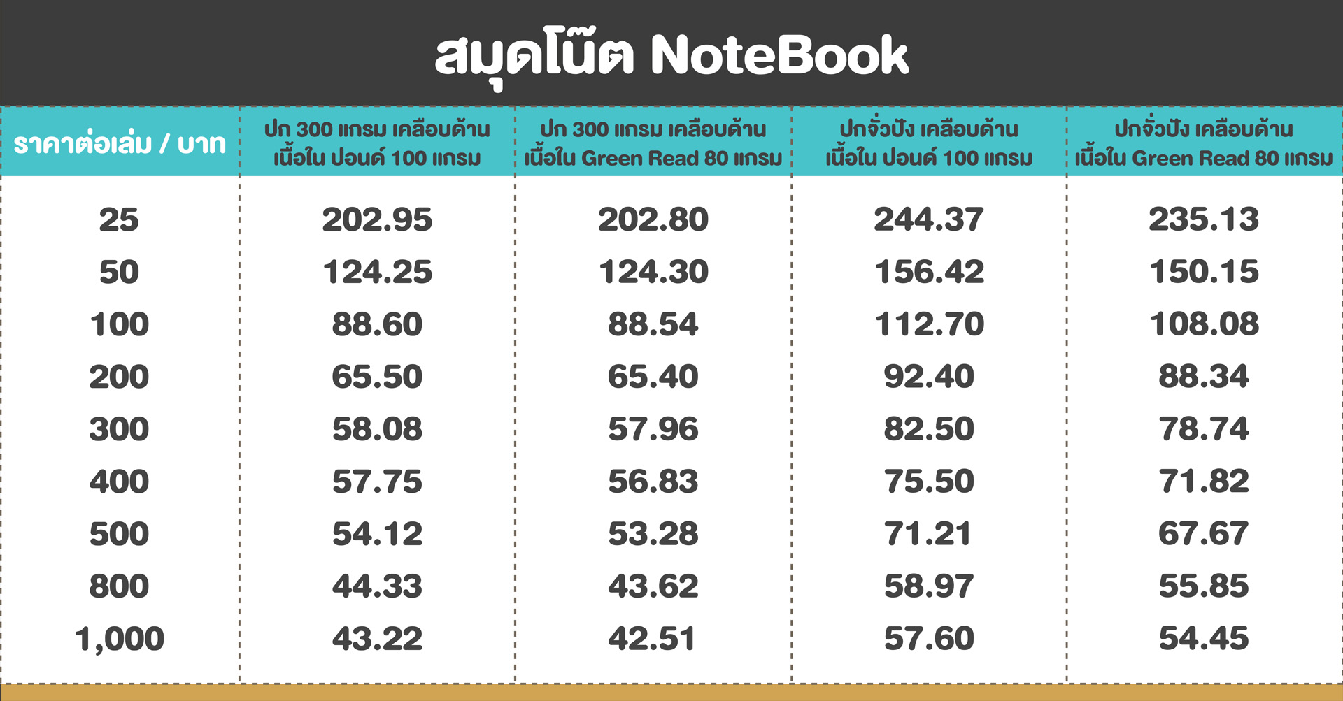 • เนื้อใน 90 ใบ ต่อ เล่ม พิมพ์ ขาว-ดำ 2 หน้า แบบเหมือนกันหมดทุกหน้า กระดาษปอนด์ขาว 100 แกรม หรือ กระดาษถนอมสายตา ( Green Read ) 80 แกรม