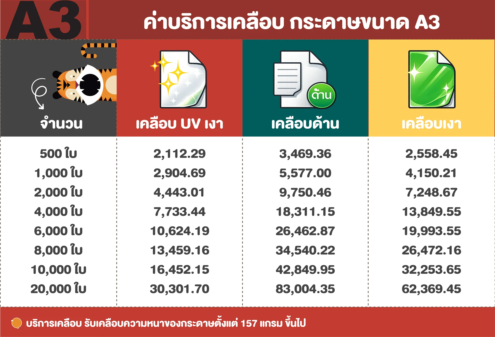 ราคาค่าเคลือบแสดงชัดเจนตามตารางด้านบน ไม่มีค่าใช้จ่ายเพิ่มเติมภายหลัง