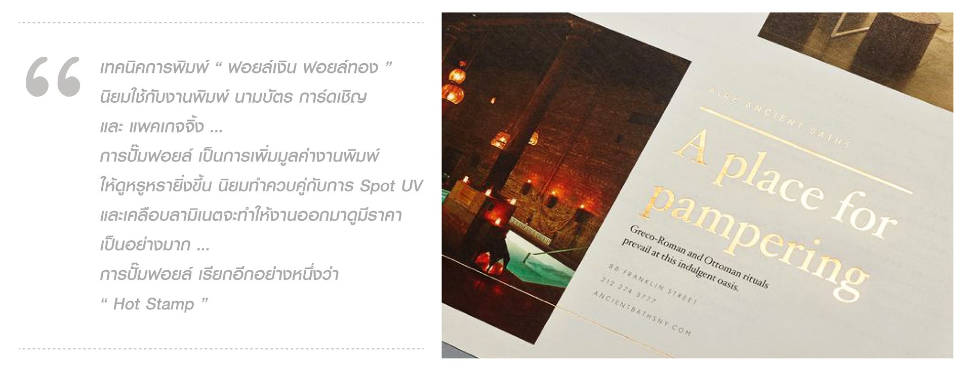 เรามารู้จักกับการปั๊มฟอยล์ หรือปั๊มเค (Foiling) การปั๊มฟอยล์จะทำให้ผิวของสิ่งพิมพ์ที่ปั๊มด้วยฟอยล์มีสีออกโลหะไปเคลือบลงบนพื้นผิวทำให้พื้นผิวบริเวณที่ทำการปั๊มจะเป็นมันเงา เพิ่มมูลค่าให้กับตัวอักษร หรือโลโก้ ที่อยู่บนงานพิมพ์ด้วยหลักการใช้ความร้อนละลายฟอยล์ให้ไปติดบนพื้นผิวจึงเรียกอีกอย่างหนึ่งว่า “ Hot Stamp ”