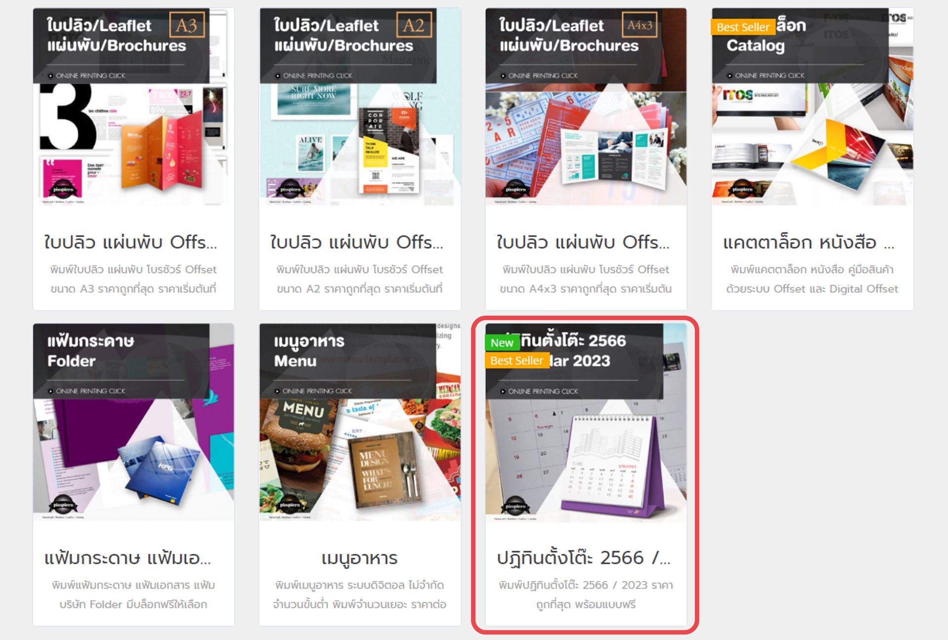 1. เมื่อเราเข้ามาที่หน้าเว็บไซต์ของ พิมพ์เพลินพริ้นท์ เราจะเจอกับบริการสิ่งพิมพ์หลากหลายอย่าง ให้เลือกคลิ๊กที่ กล่องผลิตภัณฑ์ ปฏิทินตั้งโต๊ะ 2566 / 2023